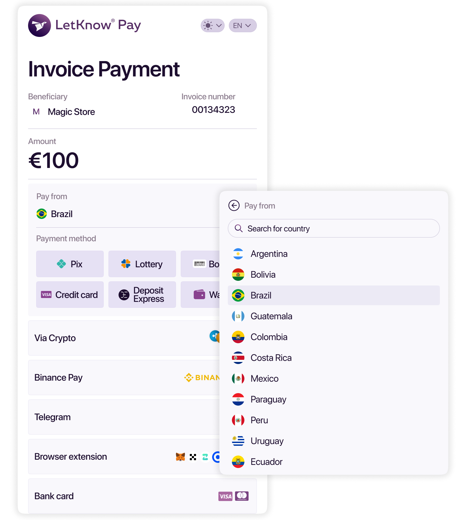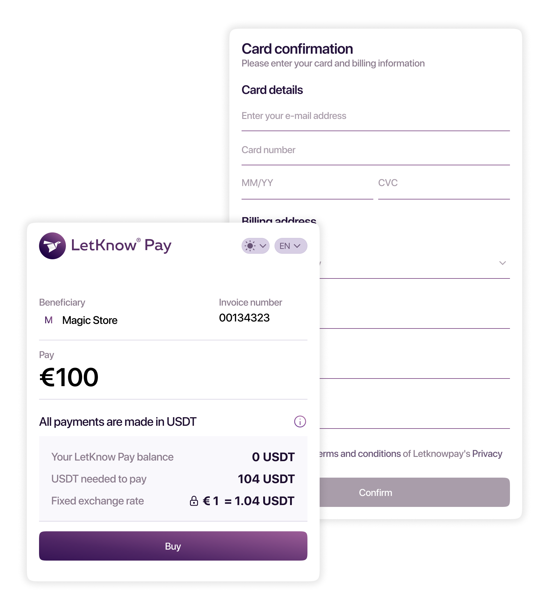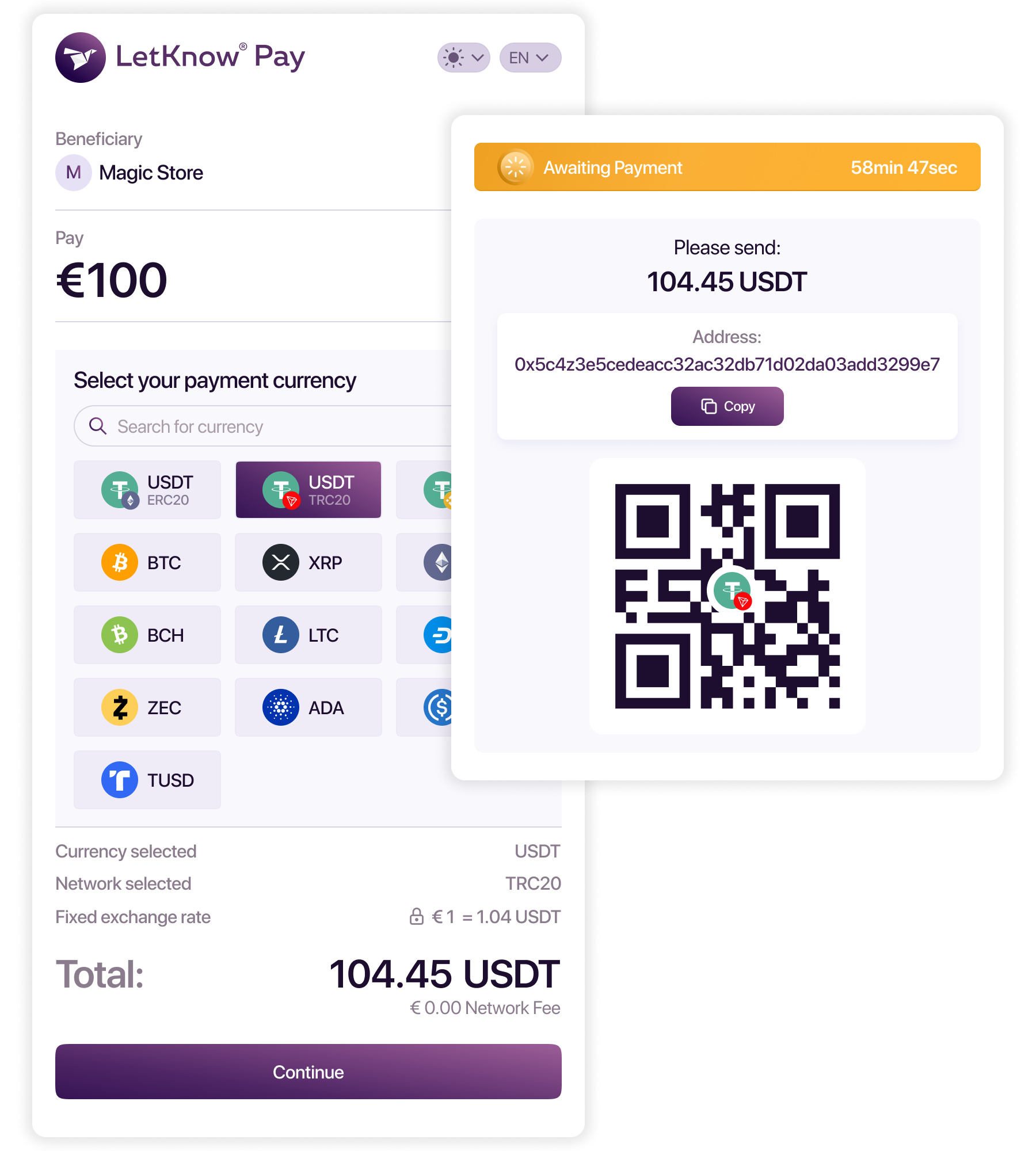 Accept multiple digital currencies with a built-in exchange service without redirecting your clients to a third-party payment page, settle your favourite currency